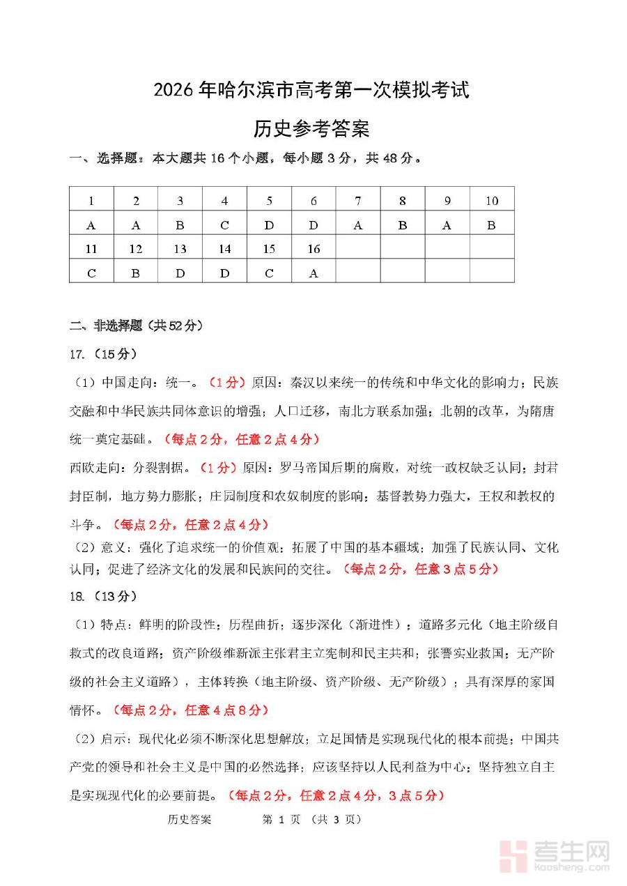 《2026年哈尔滨市高考第一次模拟考试历史试题 2026哈尔滨市历史一模参考答案》是针对2026年高考的区域性模拟考试配套资料,涵盖了哈尔滨市高考第一次模拟考试的历史试题及对应的参考答案两部分内容。作为高考复习初期的重要备考资源,该资料紧密贴合当地高考备考的阶段性需求,为考生提供了与区域命题趋势相契合的练习素材和参考依据。