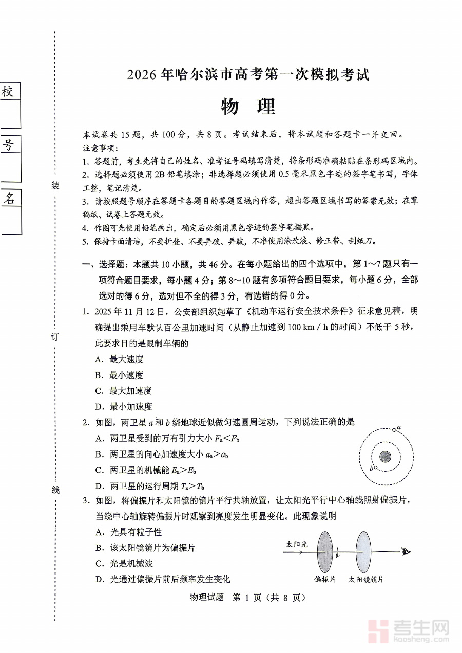 本试题适用于2026届哈尔滨市高三物理学习者及相关教学工作者,作为高考前首次模拟检测工具,其核心价值在于帮助学生熟悉高考物理考试形式与节奏,明确备考重点方向,辅助师生共同调整复习策略,为后续复习阶段的高效推进奠定基础。