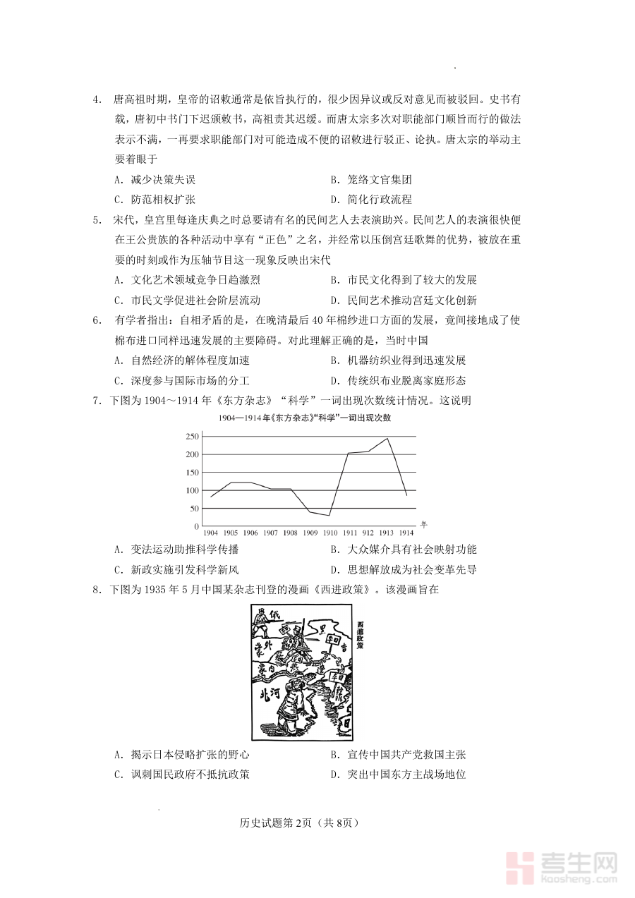 作为高三下学期初期的适应性测试资料,它可用于学生对自身历史学科知识掌握情况的学情诊断,帮助教师和学生精准识别学习中的薄弱环节;同时也能为师生制定个性化备考规划提供数据支撑,助力调整复习策略以确保内容与考试要求高度契合;此外还能让学生熟悉历史考试的时间分配与答题规范,逐步提升应试技巧。