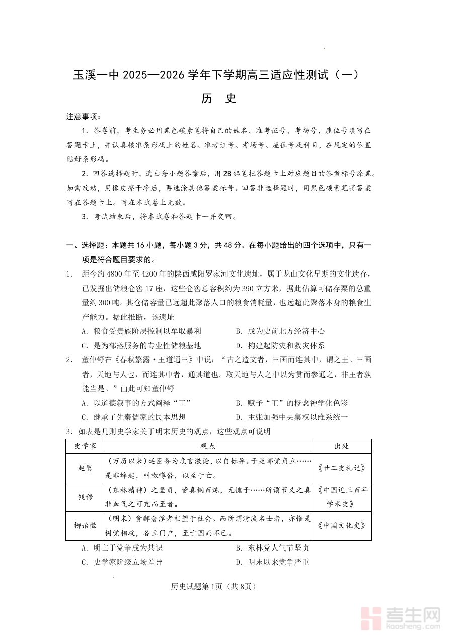 《玉溪一中2025一2026学年下学期高三适应性测试(一)历史》是针对玉溪一中2025-2026学年下学期高三年级学生设计的历史学科适应性测试资料,属于高三阶段重要的阶段性检测资源。该资料贴合学年下学期的复习进度,旨在通过标准化的测试形式,帮助学生提前适应高考历史科目的考查模式与节奏,为后续的系统复习提供方向指引。
