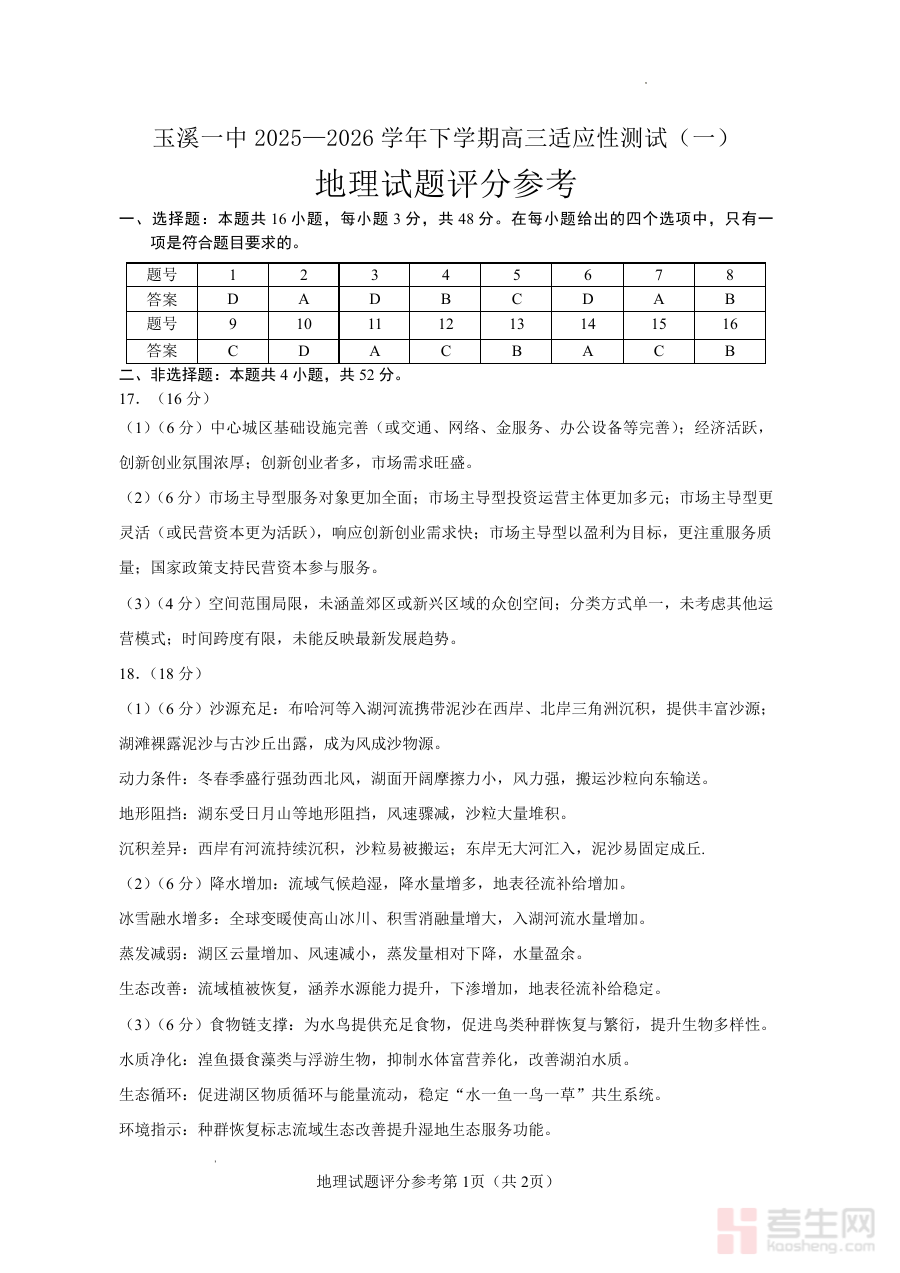 《玉溪一中2025一2026学年下学期高三适应性测试(一)地理答案》是云南省玉溪市玉溪一中针对2025至2026学年下学期高三年级首次适应性测试配套的地理学科答案资料,属于高三阶段关键的备考辅助资源,与对应测试试卷共同构成完整的阶段性检测体系。