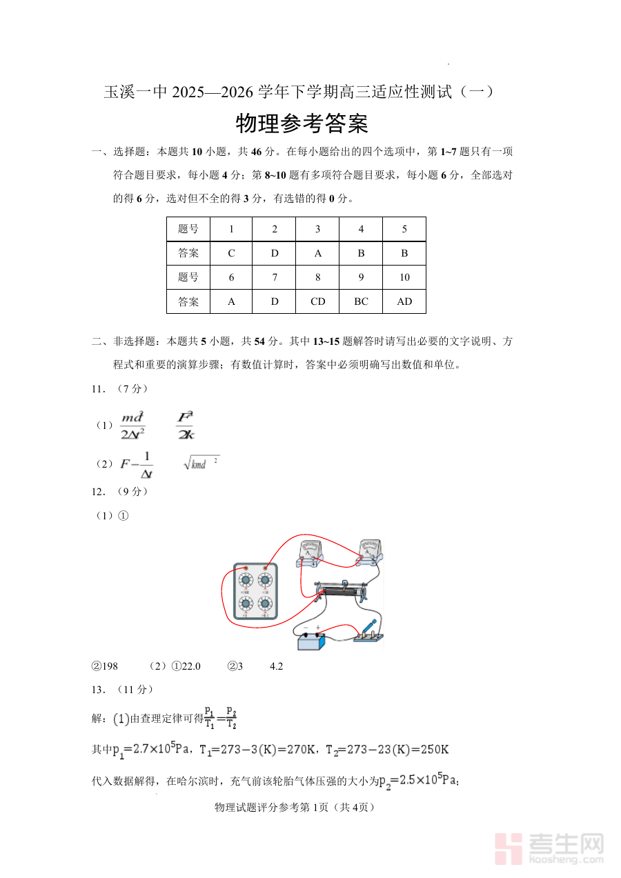 《玉溪一中2025一2026学年下学期高三适应性测试(一)物理答案》是针对云南省玉溪市玉溪一中在2025-2026学年下学期面向高三学生开展的第一次适应性测试的物理学科答案资料,属于高三阶段重要的备考辅助材料,能够帮助使用者对应测试内容完成答案核对与结果分析。