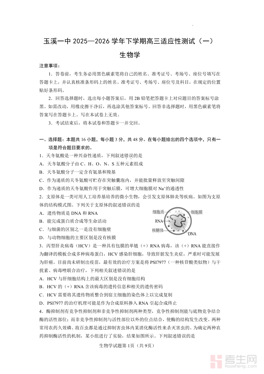《玉溪一中2025一2026学年下学期高三适应性测试(一)生物》是玉溪一中在2025至2026学年下学期面向高三学生开展的首场适应性测试生物学科资料,属于区域重点高中阶段性备考资源体系的关键部分。该测试紧密结合高三下学期的备考进程,以模拟高考生物科目的考查场景为核心目标,为师生后续的备考工作提供清晰的方向指引与实践依据。