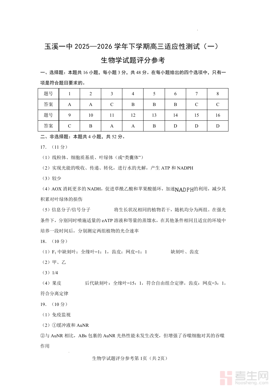 《玉溪一中2025一2026学年下学期高三适应性测试(一)生物答案》是玉溪一中针对2025至2026学年下学期高三年级生物学科开展的首次适应性测试配套答案资料。该测试属于高三阶段关键的适应性练习环节,旨在帮助学生提前适应高考生物考试的命题风格与答题节奏。作为与测试卷配套的核心资源,它为师生提供准确的作答参考依据,是该阶段备考体系中不可或缺的组成部分。