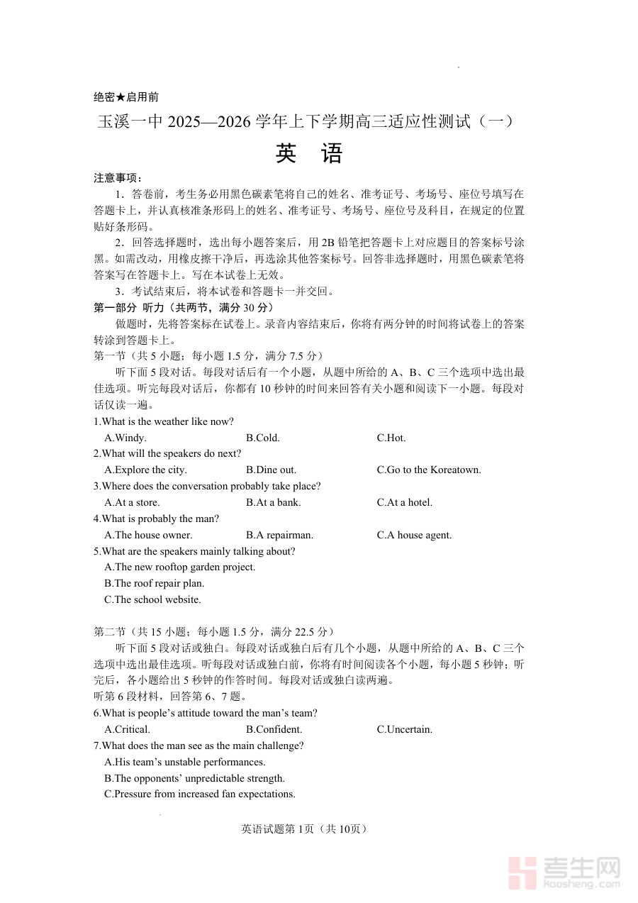 《玉溪一中2025一2026学年下学期高三适应性测试(一)英语》是玉溪地区重点中学玉溪一中在2025至2026学年下学期面向高三学生推出的首场适应性测试英语学科资料,属于高三阶段重要的阶段性检测类备考资源,紧密贴合该学年下学期高三英语教学进度与高考备考方向,为学生搭建与实际教学节奏相匹配的标准化测试场景。