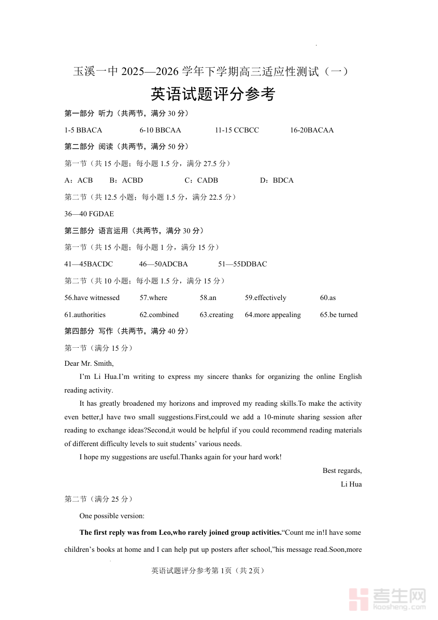 《玉溪一中2025一2026学年下学期高三适应性测试(一)英语答案》是针对2025-2026学年下学期云南玉溪地区高三学生适应性测试的配套英语答案资料,属于高三阶段重要的备考辅助材料,与对应测试卷形成完整的备考资源组合,为师生提供测试结果的精准参考依据。