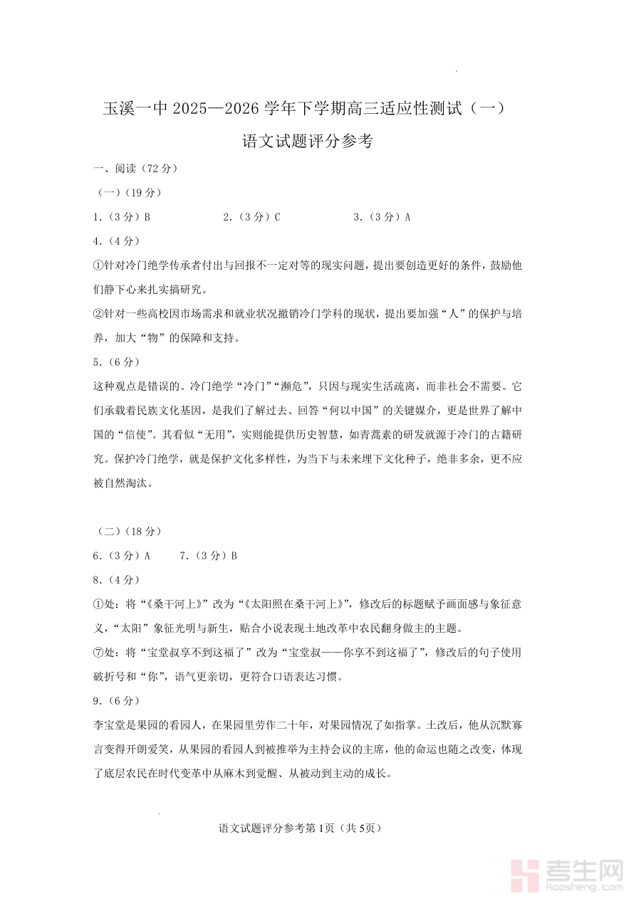本资料的适用人群明确:首先是玉溪一中2026届高三学生,通过核对答案可清晰了解自身学习状况,调整备考方向;其次是该校高三语文教师,利用答案开展教学评估与学情诊断,助力教学决策;此外,其他同类高中的高三学生及语文教师也可参考这份资料,了解适应性测试的考查重点与评价标准,为自身的备考或教学工作提供有益借鉴。