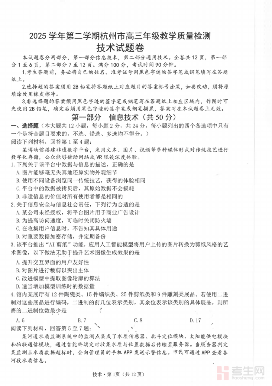 《技术试题卷 【浙江卷】浙江省杭州市2025学年第二学期杭州市高三年级教学质量检测(杭州二模)(4.7-4.9)》是2025学年第二学期浙江省杭州市针对高三年级开展的教学质量检测(杭州二模)的技术学科试题卷,为高三学生备考该次检测提供了直接对应的练习资料,能够帮助学生提前熟悉考试的整体框架与考查方向。