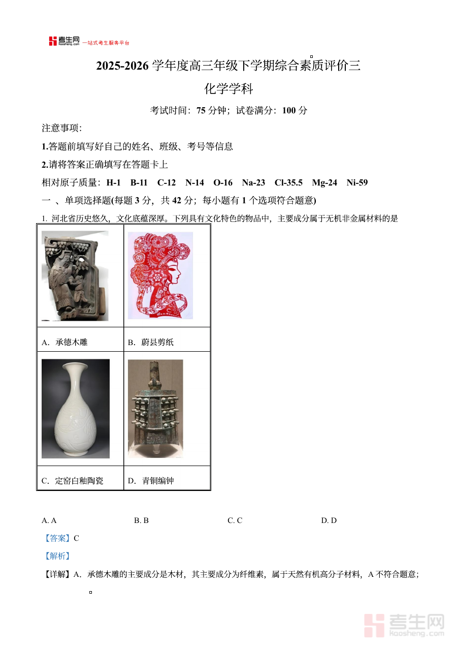 《河北衡水中学2025-2026学年度高三年级下学期综合素质评价三 化学学科试卷 Word版含解析》是河北衡水中学针对2025-2026学年高三下学期第三次综合素质评价考试推出的化学学科专用备考资料,紧密贴合该阶段高三化学的学习进度与评价目标设计而成。