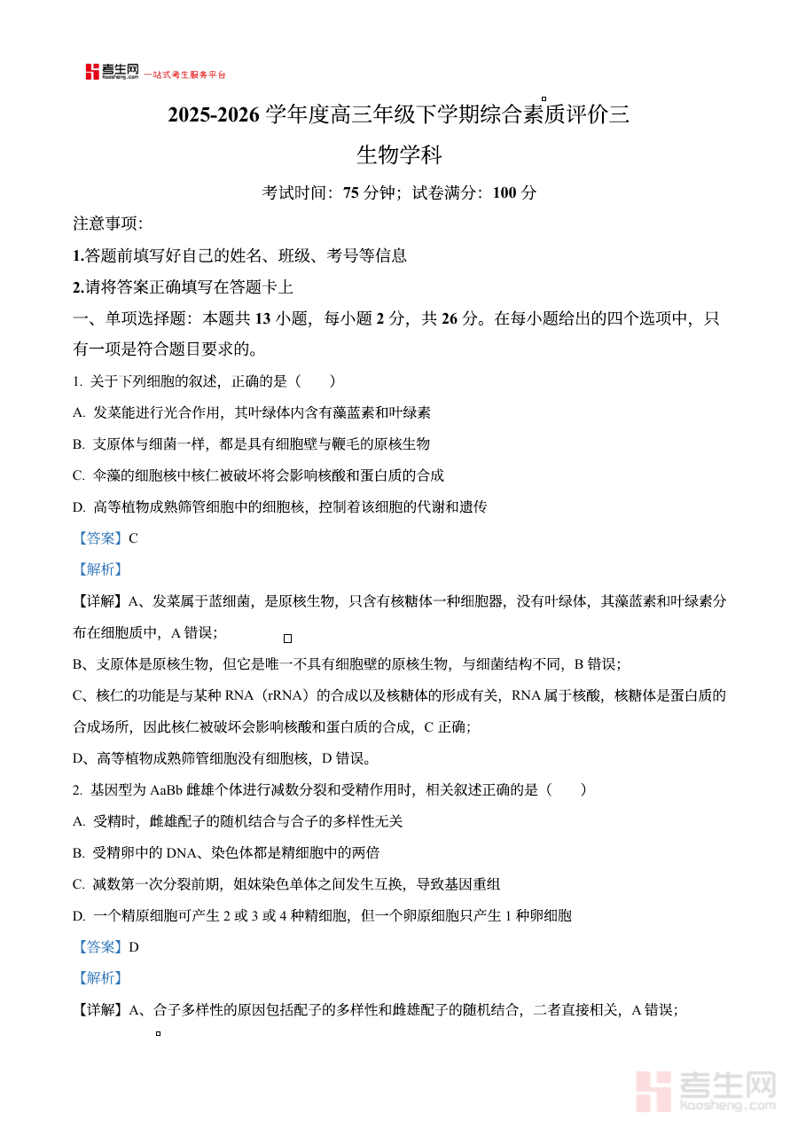 《河北衡水市桃城区河北衡水中学2025-2026学年度高三年级下学期综合素质评价三生物学科 Word版含解析》是针对河北衡水市桃城区河北衡水中学2025-2026学年度高三下学期生物学科综合素质评价三的备考资料,结合该学年度高三阶段的教学进度与评价需求编制,为师生提供与考试要求匹配的练习与参考资源。