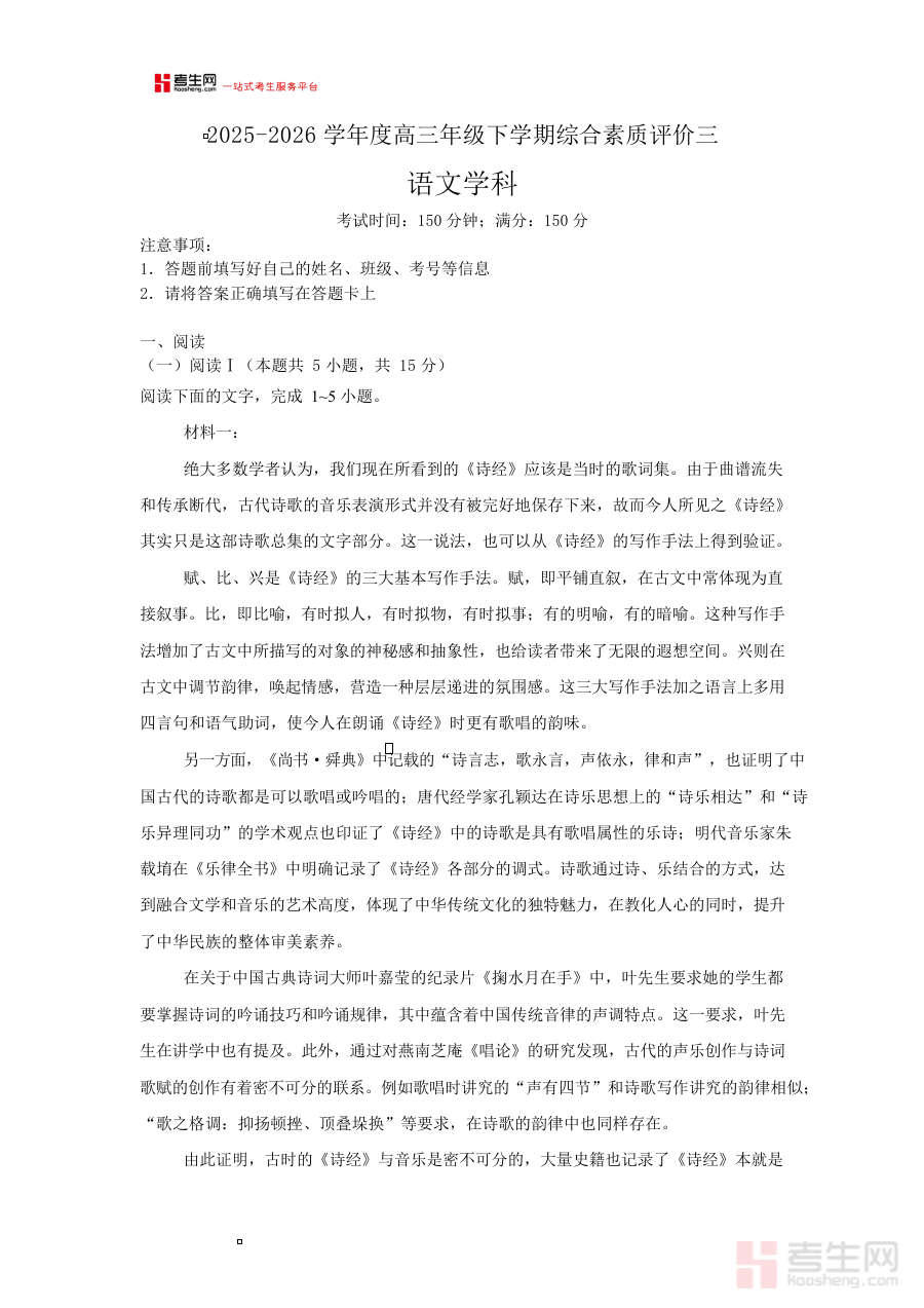 《2025-2026学年度高三年级下学期综合素质评价三语文试卷》是2025至2026学年度面向高三年级下学期学生设计的语文综合素质评价类考试资料,紧密贴合高三下学期语文学习的阶段性目标与综合素质评价的核心要求,为学生提供与本阶段学习进度高度匹配的评价载体,助力学生提前熟悉该类型评价考试的整体流程与考察重点,为后续的学习调整奠定基础。