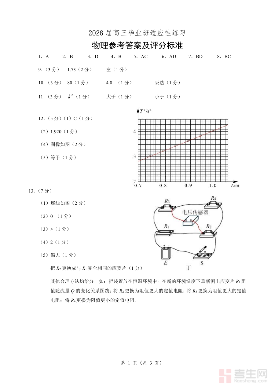 本资料适用于福建泉州市2026届高三物理教师及学生群体,作为高三阶段适应性练习的重要配套资源,其核心价值在于通过标准化解答辅助师生开展阶段学习效果评估,助力学生提升物理学科应试能力与知识应用水平,为后续系统复习与备考规划提供有力支持。