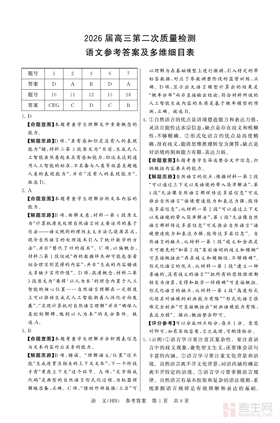该资料适用于2026届高三年级学生群体,尤其是参与本次八省T8联考四月阶段练习的湖北地区学生及相关语文教师。对于学生而言,它能助力其完成阶段性学习效果的自我评估与查漏补缺,为高考前的针对性复习提供精准指引;对于教师而言,可借助该答案深入分析学生群体的共性问题与个性化不足,优化教学计划与备考指导方案,提升教学与备考的有效性和针对性。