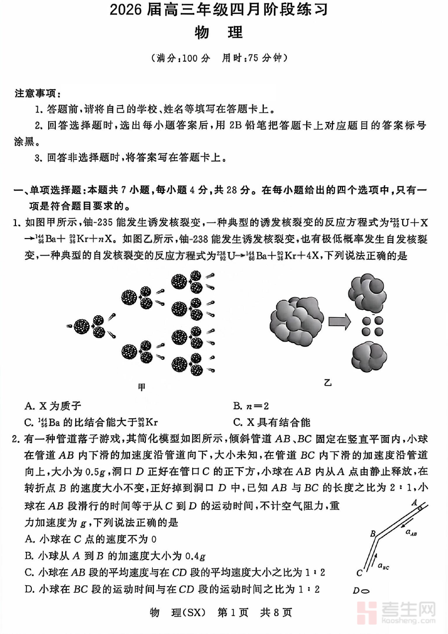 《八省T8联考2026届高三年级四月阶段练习 物理》是面向参与八省T8联考的2026届高三学生推出的物理学科阶段性练习资料。八省T8联考作为区域性重要联合考试,其阶段练习与高三备考节奏深度契合,四月阶段处于高三复习进程中的关键节点,该资料旨在为学生提供贴合联考命题方向的阶段性训练载体,助力学生适应联考的考查逻辑与内容框架。