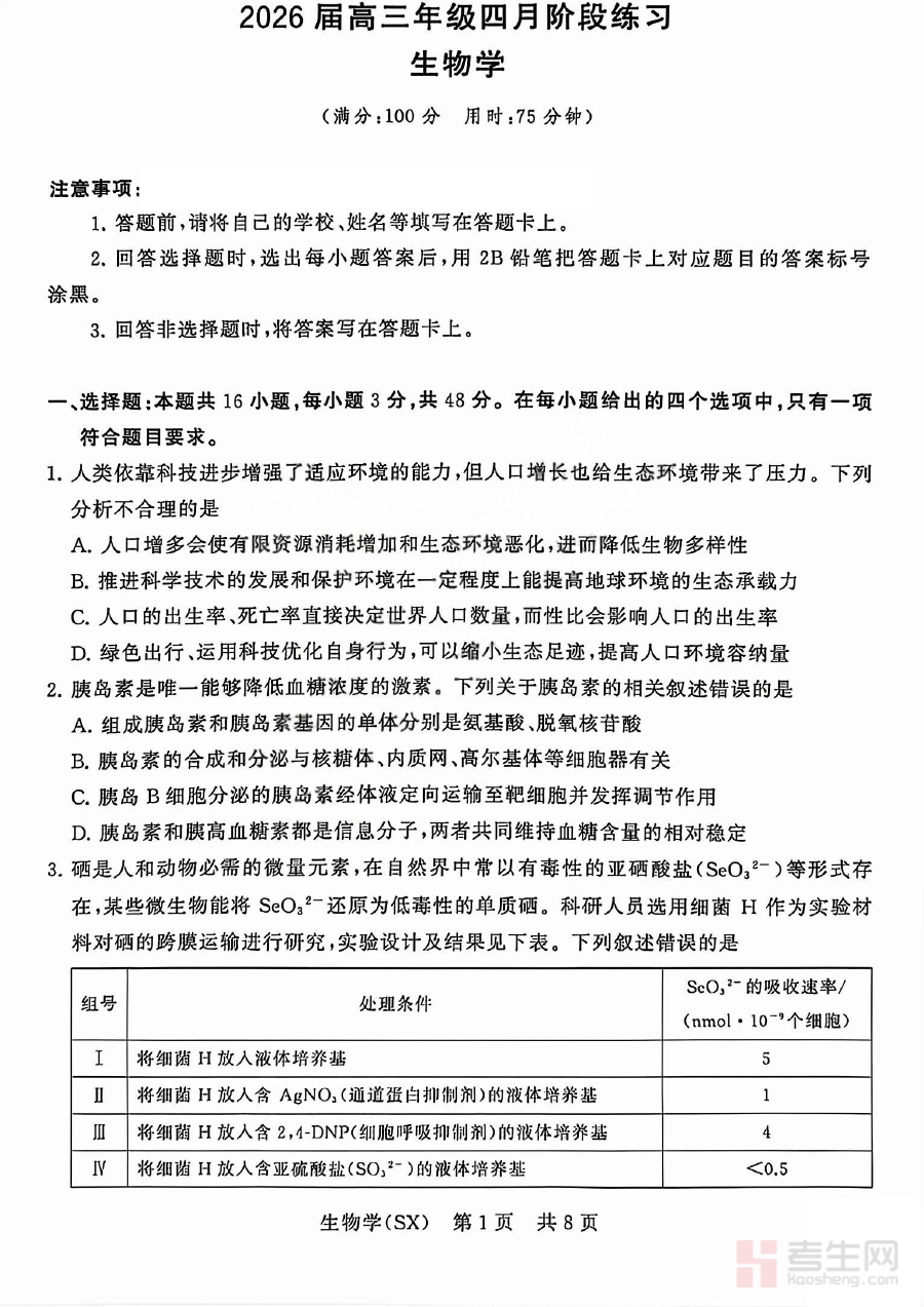 本资料适用于2026届高三年级学生,尤其适合参与八省T8联考的学生群体使用。其四月阶段练习的属性能够帮助学生巩固前期复习成果,及时发现并弥补知识漏洞,为后续的联考冲刺及高考生物学科备考筑牢基础;同时该资料的阶段检测价值也能让学生提前熟悉联考的测试节奏与考查风格,增强应试信心与适应能力,助力学生在关键备考阶段实现稳步提升。