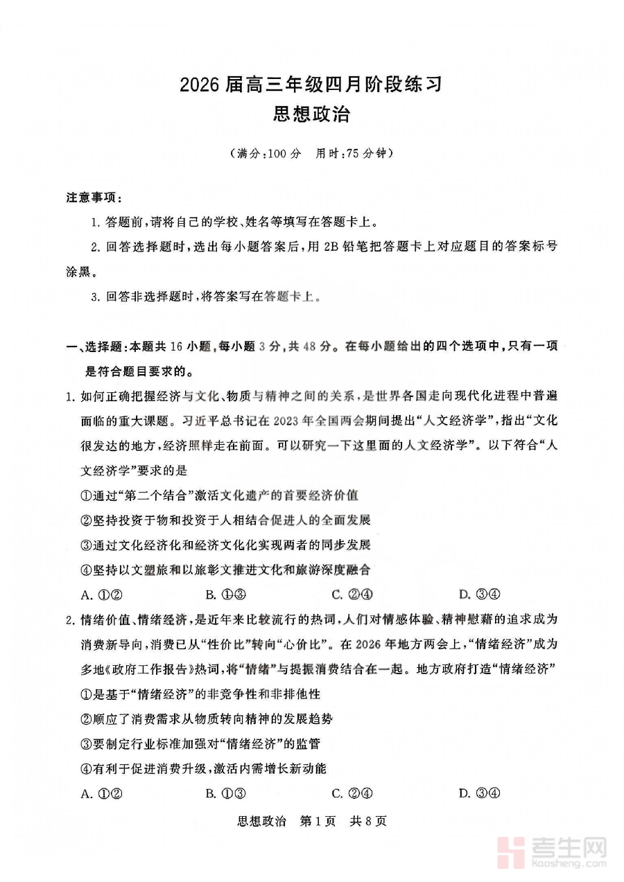 《【T8联考】2026届高三4月阶段练习(湖北版)政治+答案》是面向2026届湖北省高三学生的T8联考阶段性练习资料,包含政治学科试题及配套答案。作为T8联考体系下的阶段性练习,该资料贴合湖北地区高三教学进度与考试要求,为学生提供针对性的备考支持。
