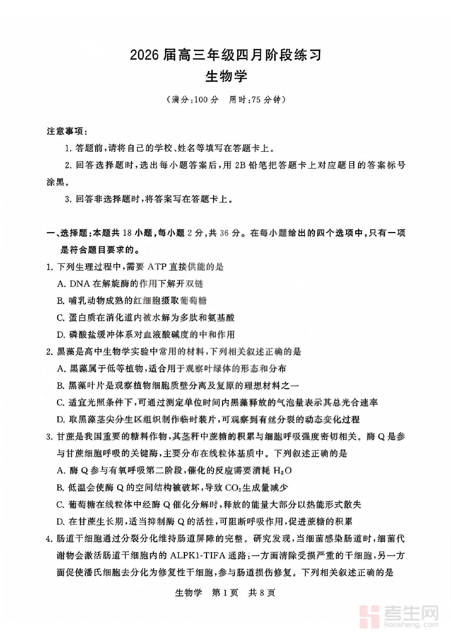 该资料适用于2026届湖北省高三生物学科的师生群体。对于学生而言,它是4月阶段复习效果的重要检测工具,能帮助其在高考前的关键时期查漏补缺,调整备考策略;对于教师来说,它可作为阶段教学评估的参考依据,辅助制定更具针对性的教学方案与训练计划。整体而言,这份资料在高三生物备考的阶段性提升过程中具有显著实用价值,能够助力师生共同推进复习进程,为高考生物学科取得优异成绩奠定坚实基础。