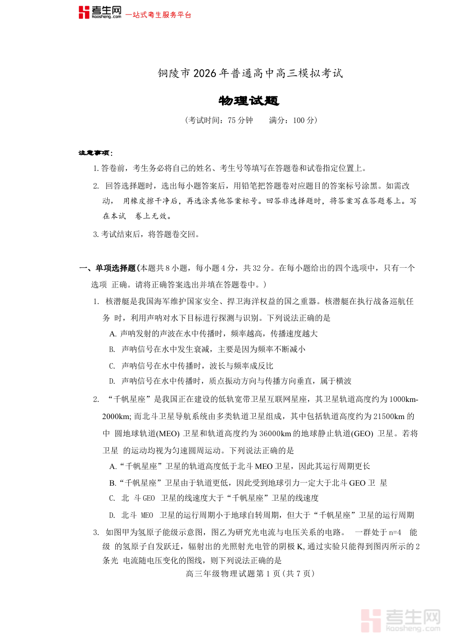其适用人群主要为2026届安徽省铜陵、黄山、宣城三市的高三学生及物理教师,也可作为其他同阶段高三学生了解同类地区二模考试物理学科考查方向的参考资料;通过该资料的使用,学生能提前熟悉二模考试的检测形式与要求,教师能更有针对性地开展教学指导,共同提升备考的有效性与针对性。