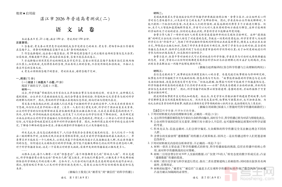 本资料主要适用于2026届湛江市高三语文教师、学生及相关教育教研人员。对于学生而言,通过参与该模拟考试能有效检验阶段性复习成效,及时调整学习重点与方法;对于教师而言,可基于考试结果优化教学策略,开展针对性辅导;对于教研团队,该资料能为区域高三语文备考的整体规划与资源整合提供参考,助力提升本地语文复习的科学性与有效性。