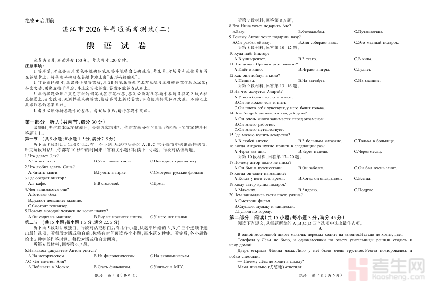 《26届4月湛江高三二模·俄语3.27》是针对2026届湛江地区高三学生俄语学科的第二次模拟考试配套备考资料。该资料紧密结合湛江本地高三俄语教学的阶段性目标与二模考试的考查定位,旨在为学生提供贴合本地考试趋势的复习支持。作为高三二轮复习阶段的重要参考资料,它能够帮助学生对接本地模拟考试的要求,提前熟悉考试的整体框架与考查方向,为后续的针对性复习奠定基础。