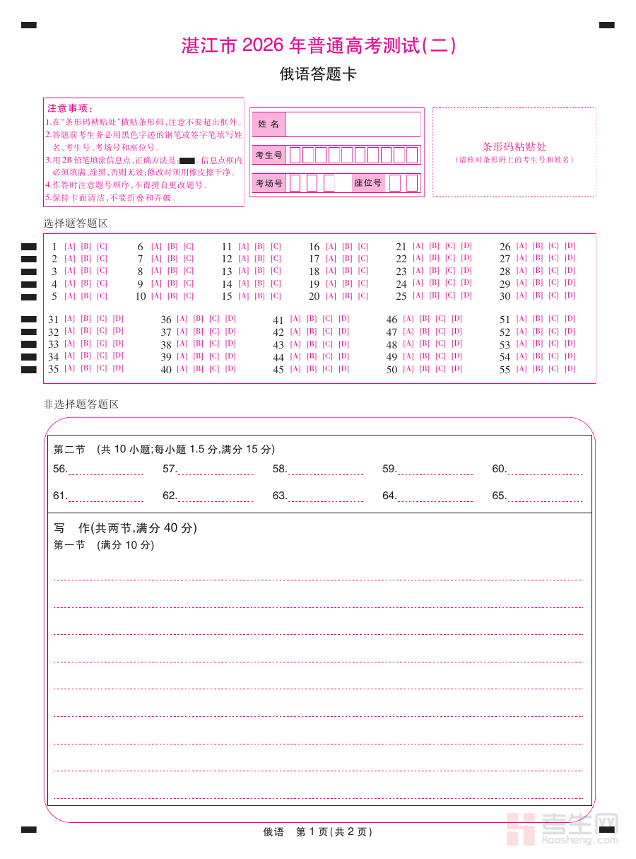 《26届4月湛江高三二模·俄语答题卡3.26》是针对2026届湛江地区高三学生俄语学科第二次模拟考试设计的专用答题卡资料。作为高三阶段重要的模拟考试配套工具,它与湛江二模俄语试卷的题型结构、作答要求高度匹配,能够帮助学生提前熟悉考试的作答规范和答题卡布局,为正式考试做好准备。