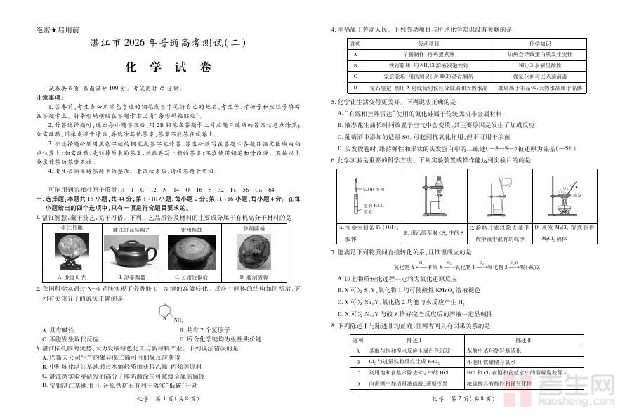 《26届4月湛江高三二模·化学3.26》是面向2026届湛江地区高三学生的化学学科第二次模拟考试备考资料,紧密结合当地高三化学教学进度与二模考试的命题特点,反映区域内化学学科的考查方向与要求,为学生提供贴合本地考试实际的复习素材,帮助学生提前熟悉二模考试的形式、节奏与难度层级,是高三化学复习过程中具有区域针对性的阶段性备考资源。