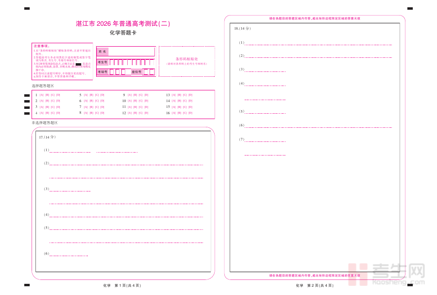 此资料适用于2026届湛江地区的高三化学学习者,特别是即将参与二模考试的学生群体。使用该答题卡进行模拟作答,可帮助学生精准把控答题节奏与书写规范,提升应试能力;同时,它也为教师制定个性化复习计划提供参考依据,助力优化备考策略,提高整体复习效率。