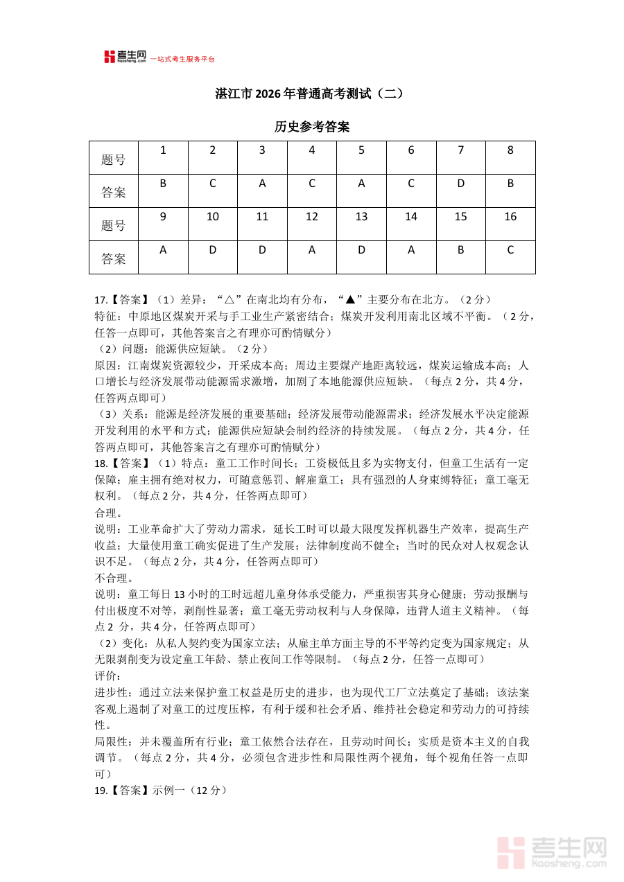 本资料适用于2026届湛江地区的高三历史考生、一线历史教师及备考指导人员;考生通过参考答案能及时明确自身作答的优势与不足,定位知识薄弱区域并进行针对性巩固;教师则可依托答案开展试卷讲评与学情总结,为后续复习规划提供方向支撑,充分发挥阶段检测在高三历史备考中的导向价值,推动备考工作更贴合考生实际需求。