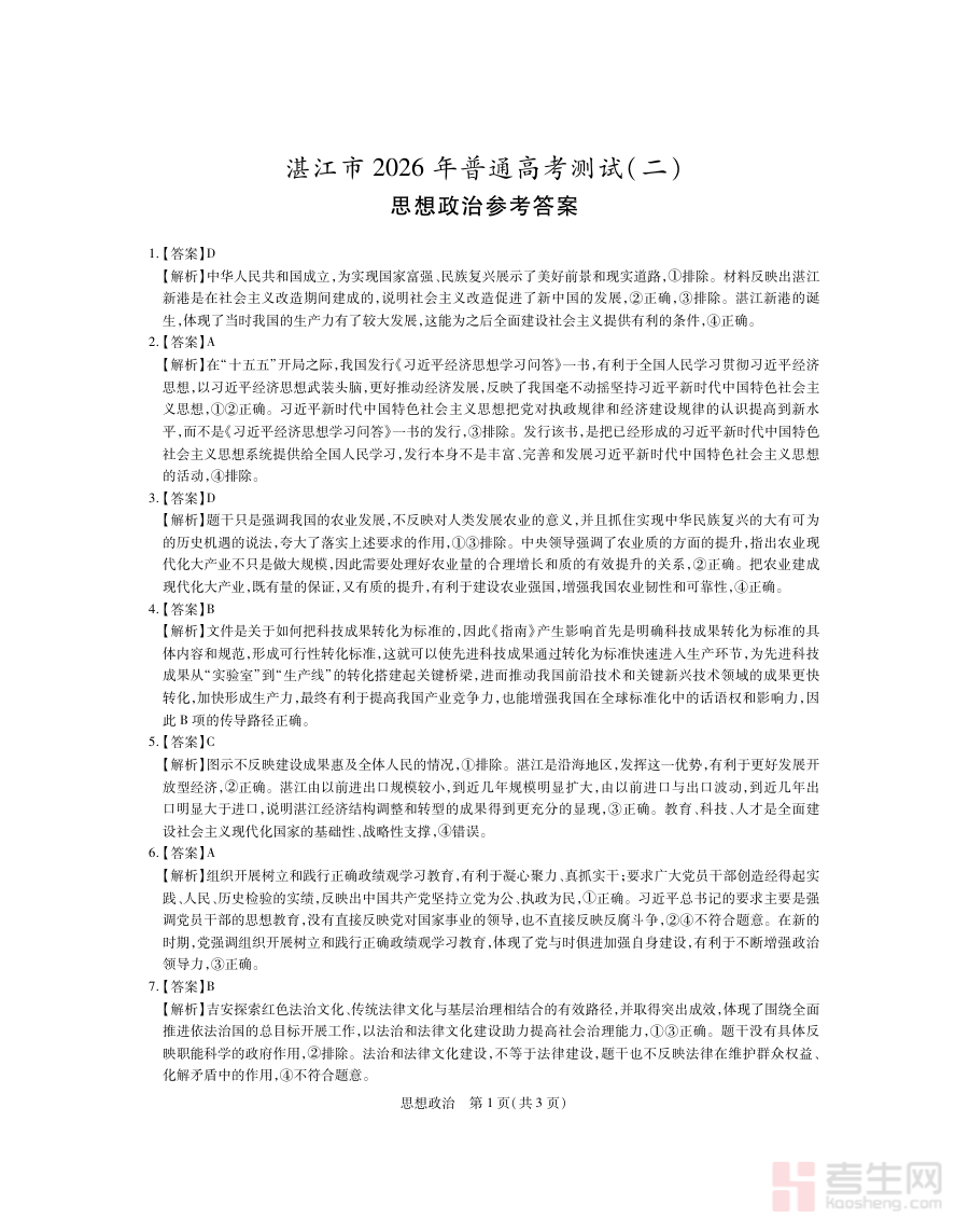 此答案资料主要适用于2026届湛江地区高三思想政治学科的学生及任课教师。对于学生而言,它是阶段检测后查漏补缺、优化答题技巧的重要工具;对于教师而言,它能辅助开展教学效果评估与复习方向调整,助力学生在高考前的关键冲刺阶段实现高效复习。其价值在于通过精准的答案参考,帮助师生明确备考重点,优化复习路径,为高考思想政治学科取得理想成绩奠定坚实基础。