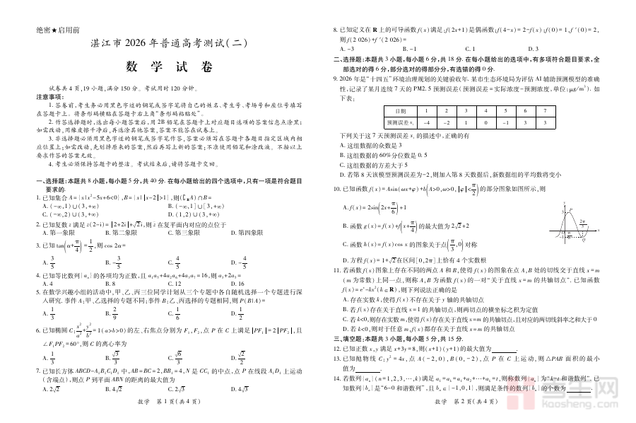 《26届4月湛江高三二模·数学3.26》是面向26届湛江地区高三学生推出的数学学科第二次模拟考试配套备考资料,充分结合了该地区高三数学教学的阶段性特点与本地考试命题的常规方向,能够为学生提供与本地模拟考试高度匹配的练习资源,帮助学生提前适应考试的形式与难度水平。
