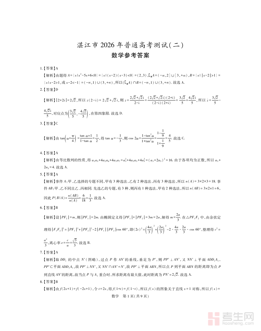 《26届4月湛江高三二模·数学答案》是面向2026届湛江地区高三学生推出的、对应第二学期第二次模拟考试的数学科目解答资料,属于高三年级下学期关键阶段的重要备考配套资源,旨在为考生和教学工作者提供该次模拟考试数学科目的标准化、精准化解答参考,助力使用者快速获取该次测评的正确结果,是高三阶段阶段性测评体系中的重要组成部分。