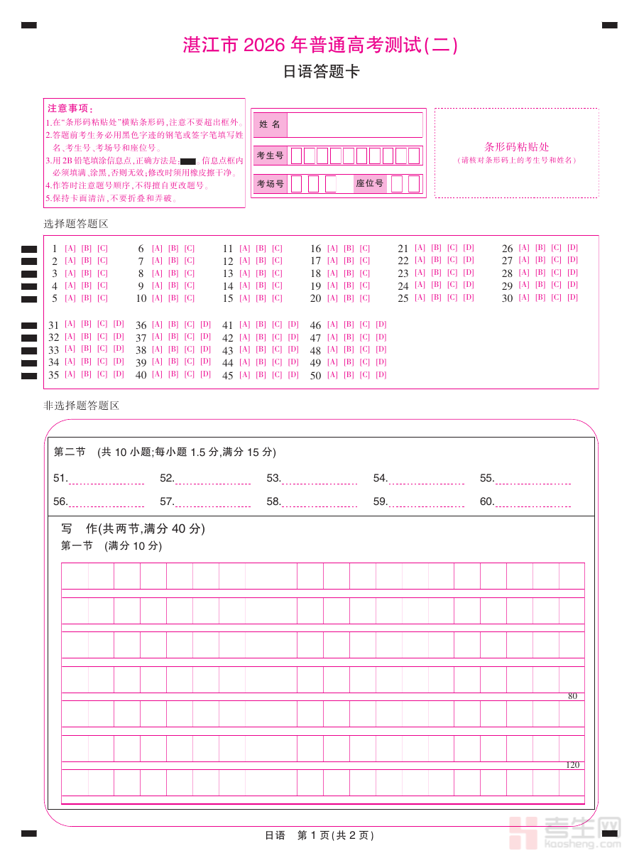 本资料主要适用于2026届湛江地区高三日语学科的考生群体,也可作为日语教师开展教学评估与备考指导的参考资源。对于考生而言,借助该答题卡进行模拟作答能提前适应高考日语考试的答题卡样式与操作要求,降低正式考试中的非知识性失误风险;对于教师来说,可通过分析考生的答题卡填写情况,精准把握学生的作答习惯与问题所在,进而优化教学策略,共同提升备考质量。