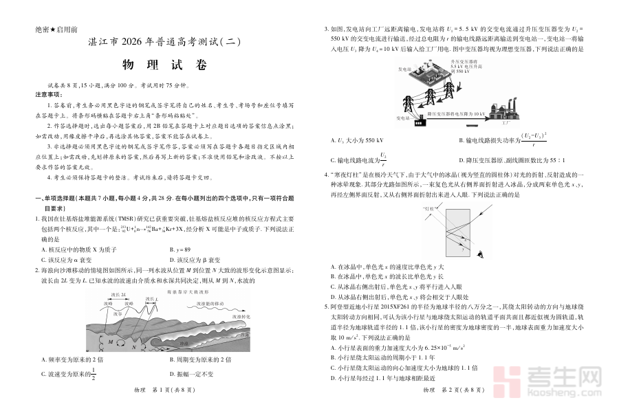 《26届4月湛江高三二模·物理3.26》是面向2026届湛江地区高三学生推出的物理学科第二次模拟考试相关备考资料。作为当地高三物理备考进程中的关键阶段性资料,它紧密贴合湛江地区高三物理教学的实际进度与高考命题的核心方向,能够有效反映出区域内对物理学科核心素养、知识应用能力及应试技巧的考查重点,为学生提供与本地备考需求高度适配的练习与检测载体。