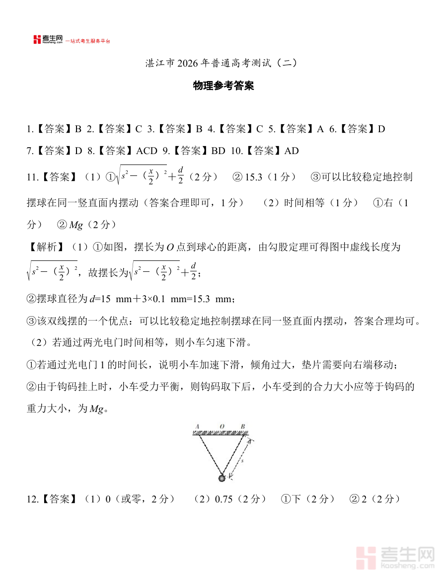 《26届4月湛江高三二模·物理答案》是针对2026届湛江地区高三学生四月第二次模拟考试的物理科目答案资料。作为区域内重要阶段性检测的配套资源,它与该次模拟考试物理试题紧密对应,为考生和教学者提供准确参考答案依据,助力了解考试考查方向与评分标准,是该阶段物理学科备考不可或缺的参考材料之一。
