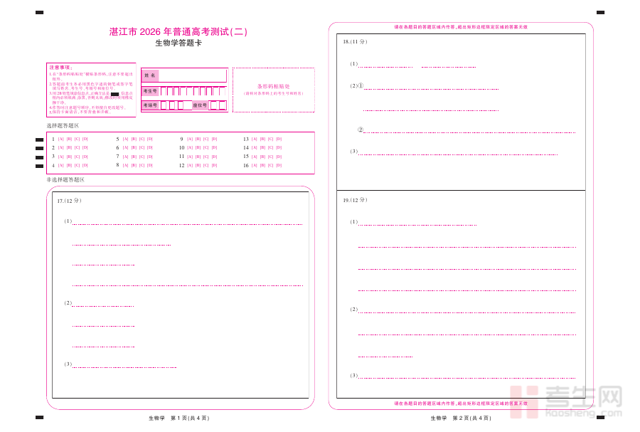 该资料适用于2026届湛江地区的高三学生及生物学教师群体:对学生而言,使用该答题卡参与二模考试能实现有效的阶段检测,及时发现学科作答中的潜在问题;对教师而言,则可依托答题卡的作答数据分析班级整体学情,调整教学计划与备考指导重点。其核心价值在于为高三生物学备考提供真实的本地模拟场景,帮助师生精准把握备考节奏与方向,为后续的高考冲刺阶段奠定坚实的实践基础。