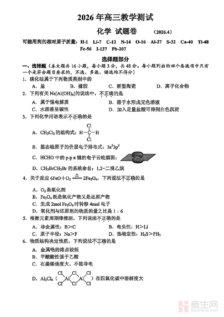 该资料主要用于高三学生化学学科的阶段性学情诊断与备考效果综合评估,帮助教师精准把握学生在化学核心知识体系构建、学科思维能力发展、应试技巧运用等方面的优势与存在不足,同时为学生自身清晰明确后续备考的重点突破方向与能力提升空间。通过该试题的系统训练与全面检测,师生能够及时调整教学策略与学习计划,进一步优化备考规划,确保整个备考过程更具针对性、科学性与有效性。