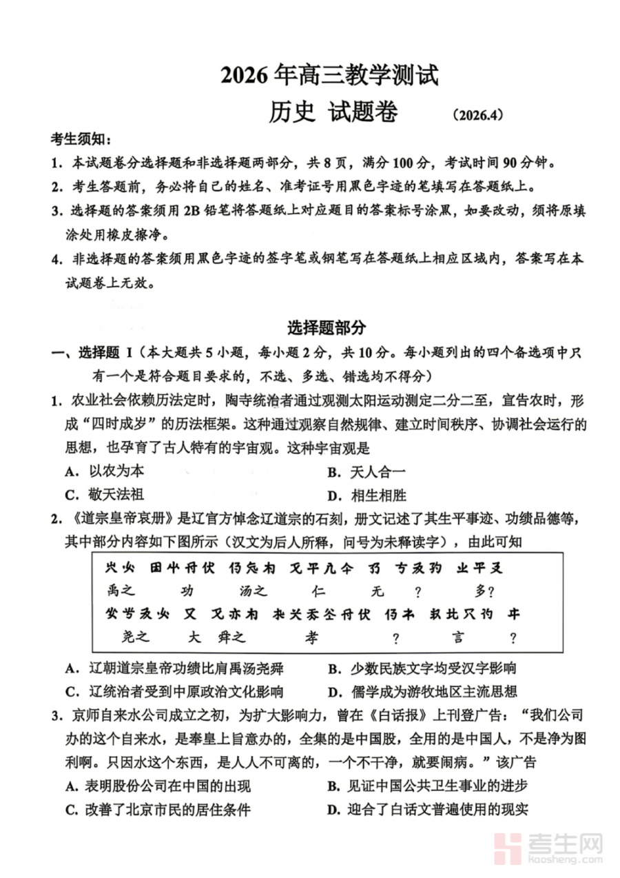该试题可用于高三师生开展历史学科的阶段性学情诊断,帮助精准识别学习中的优势与不足;同时为后续备考规划提供数据支撑,引导师生调整复习策略与重点方向;作为阶段性检测工具,它能有效检验前期复习效果,巩固已学知识体系的完整性与应用能力。