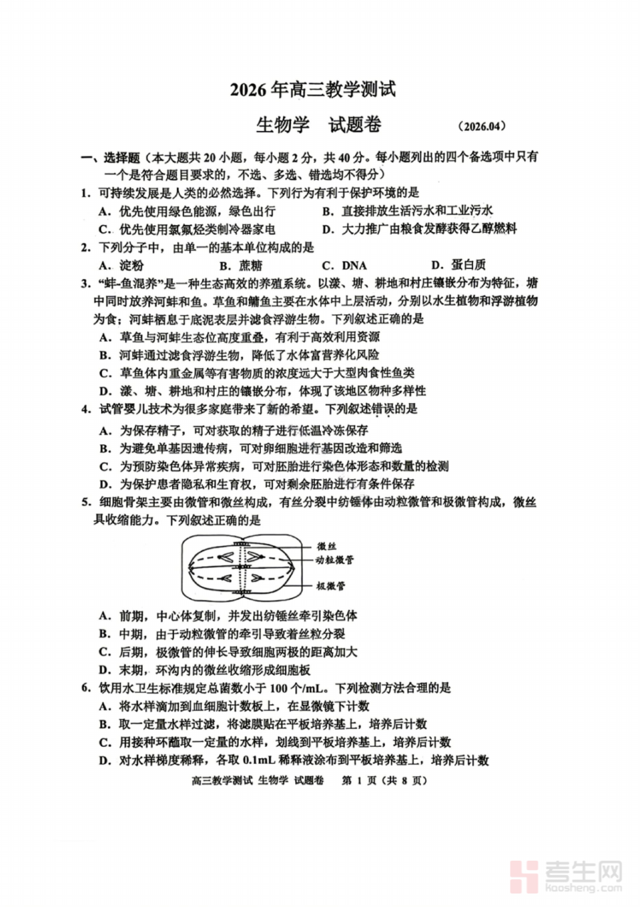 《嘉兴二模生物试题》是嘉兴地区高中生物学科的第二次模拟考试专用试题,属于区域内重要的阶段性教学检测资料,旨在为师生提供客观反映当前学习与教学成效的参考依据,助力师生把握阶段学习动态与教学方向。