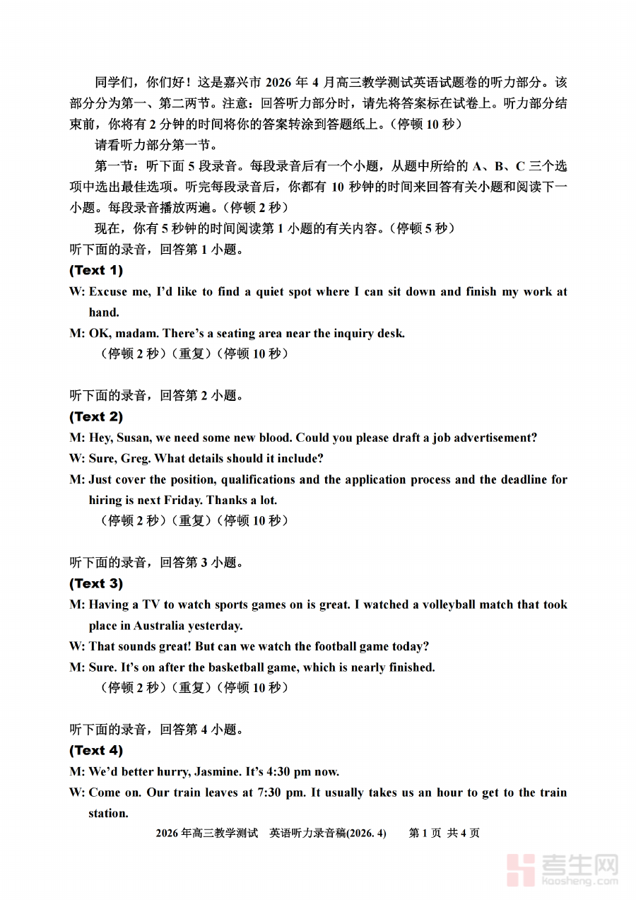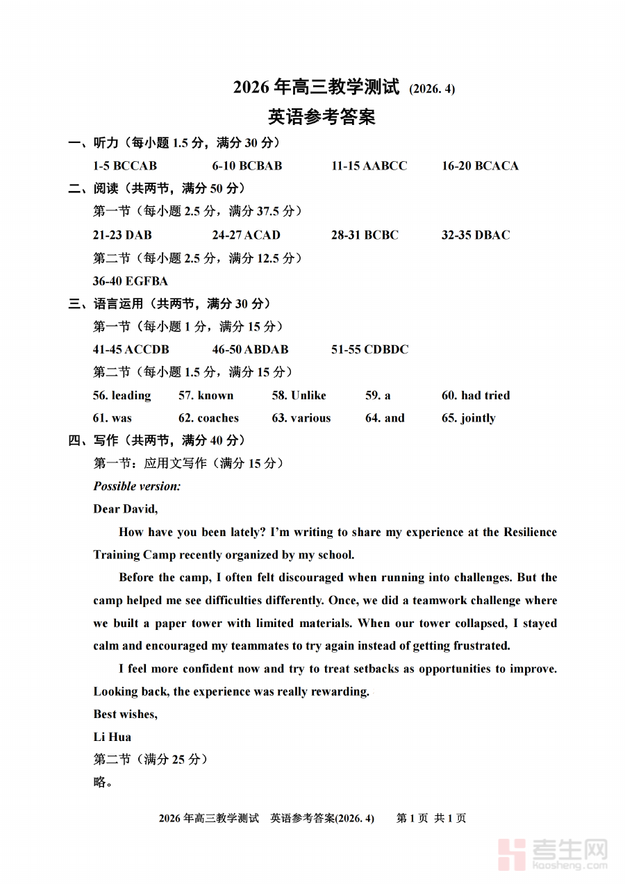 此资料适用于嘉兴地区所有参与高三二模英语考试的学生群体以及承担高三英语教学任务的教师。对于学生而言,通过对照该答案可清晰掌握自身在模拟考试中的优势与不足,明确下一阶段英语备考的具体方向和重点任务;对于教师而言,借助该答案能高效完成试卷批改和学情分析工作,为制定个性化备考规划、班级教学策略及分层辅导方案提供数据支持,助力师生在高考前关键复习阶段实现备考效率与质量的双重提升。