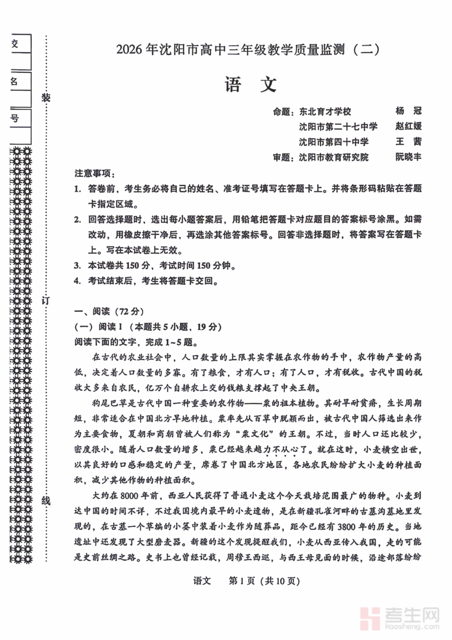 《2026.4沈阳高三二模语文试卷+答案》是2026年4月沈阳市面向高三年级学生组织的第二次模拟考试对应的语文试卷及配套答案资料。作为高三阶段区域性重要模拟考试的载体,它紧密契合当地高三语文教学的阶段性目标与考查标准,能够为师生提供与正式二模考试形式、要求高度一致的练习资源,是高三语文备考过程中具有针对性的阶段性参考资料。