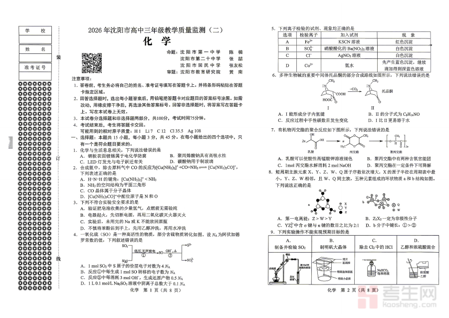 本试题适用于沈阳市即将参加2026年高考的高中三年级学生以及承担高中化学教学任务的教师群体,通过使用该试题开展阶段性检测与分析总结,能有效帮助学生及时调整备考策略、强化薄弱知识点、提升应试能力与备考效率,为高考化学科目的系统复习与冲刺阶段准备提供具有区域针对性的重要参考依据。