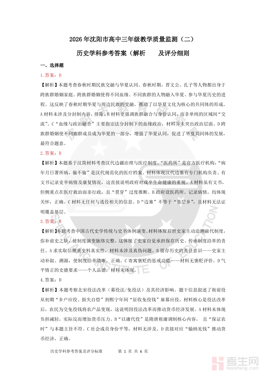 该资料适用于2026届沈阳市普通高中毕业年级的历史学科考生、一线历史教师及相关教学研究人员。对于考生,它能帮助快速核对答题结果,明确自身在历史学科核心素养与解题能力上的优势与不足;对于教师,可借助其进行试卷分析与学情评估,为班级或个体的历史备考指导提供客观依据;对于研究者,则可作为研究区域模拟考试命题趋势与评价体系的参考素材,整体上对沈阳地区高三历史学科的阶段性备考具有重要实践价值。