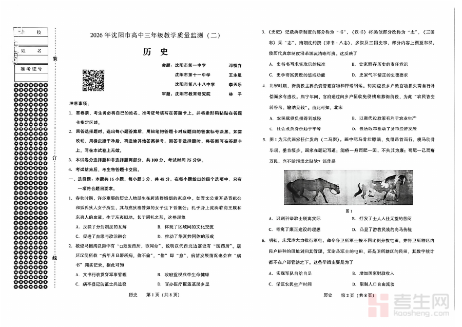 本试题适用于2026届沈阳市高三历史学科的学生、一线历史教师以及参与高三备考指导的教研人员。对学生而言,它是自我检测与提升应试能力的重要载体,能帮助明确复习方向,增强备考信心;对教师来说,它是优化教学计划与增强备考针对性的实用工具,可辅助提高复习效率;对教研人员而言,它可作为分析区域命题趋势与调整备考策略的参考依据。整体而言,该试题在高三二轮复习阶段具有重要的阶段检测与备考规划价值。