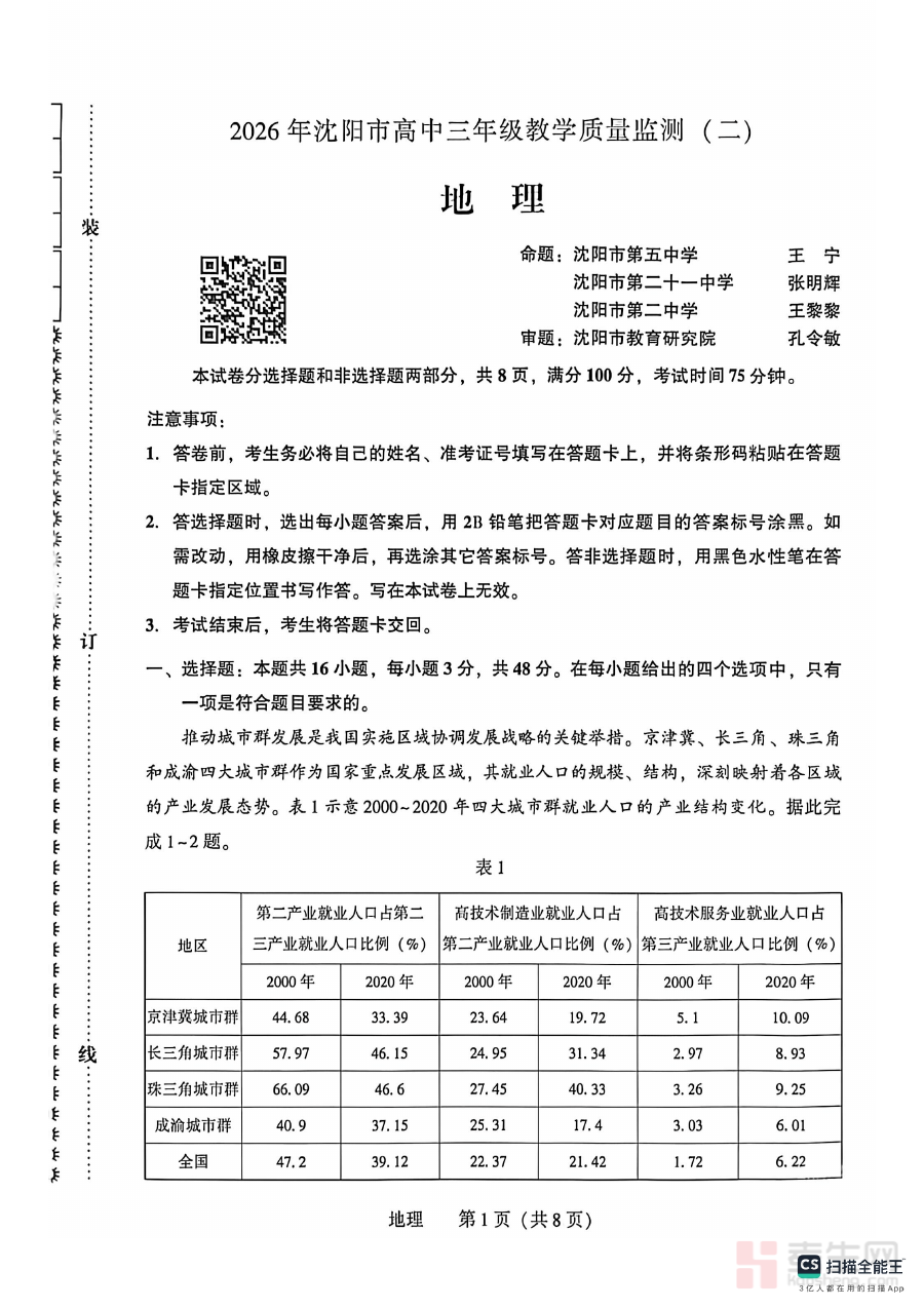 本资料适用于沈阳市2026届高三地理学科考生及相关教师群体。对于考生,通过试题练习可增强对阶段检测的适应性,助力其优化备考策略;对于教师,可依托试题分析调整教学重点,提升备考指导的针对性与有效性,共同推动地理学科备考质量的提升。