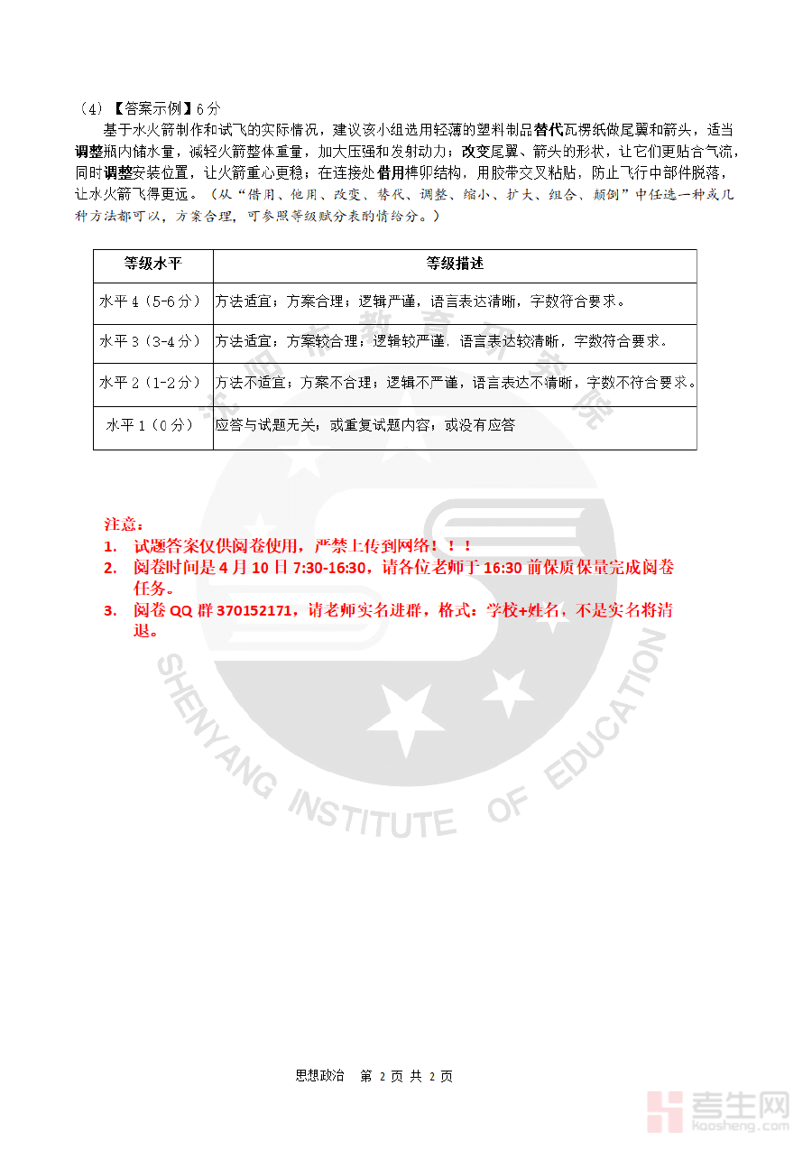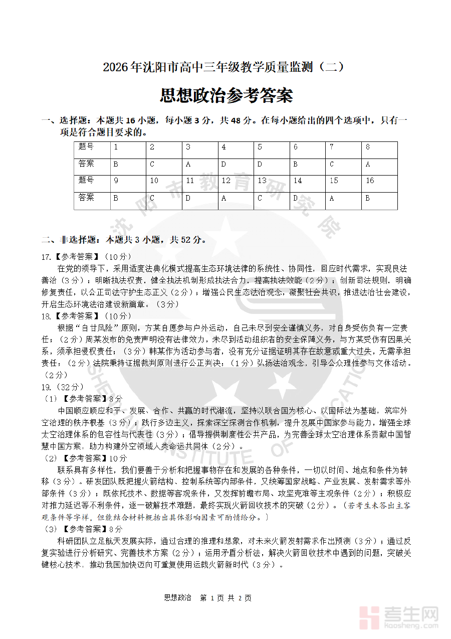 《2026年沈阳二模政治答案》是2026年沈阳市普通高中第二次模拟考试政治学科的官方配套参考答案资料,作为区域内重要的阶段性考试配套资料,其内容与该次模拟考试的命题方向及评价标准保持高度一致,紧密贴合该地区高三政治学科阶段性教学评价的实际需求,为相关教学场景及考生备考过程提供具有权威性的参考依据,助力教学与备考活动的有序开展。