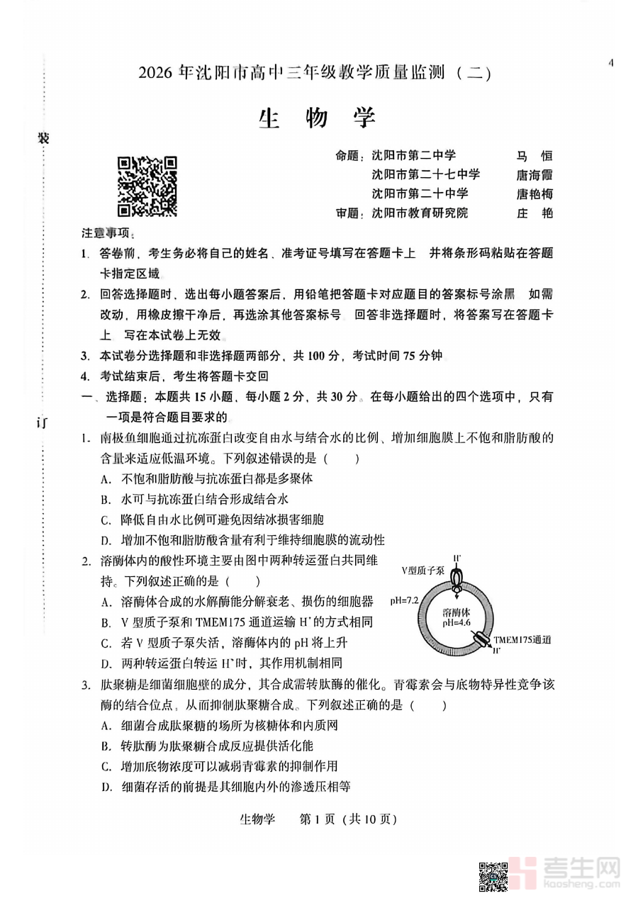 此试题主要适用于沈阳市2026届高三学生、高中生物学科教师及相关备考指导人员。对于高三学生而言,它是重要的阶段检测工具,有助于熟悉二模考试的命题特点与考查维度,提升应试技巧与综合能力;对于教师来说,它是开展学情分析与教学调整的核心参考;对于备考指导人员而言,可借助该试题把握区域生物学科备考趋势,为考生提供更具针对性的备考建议与策略支持。