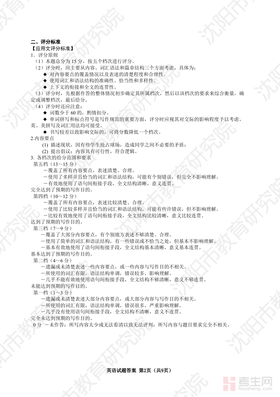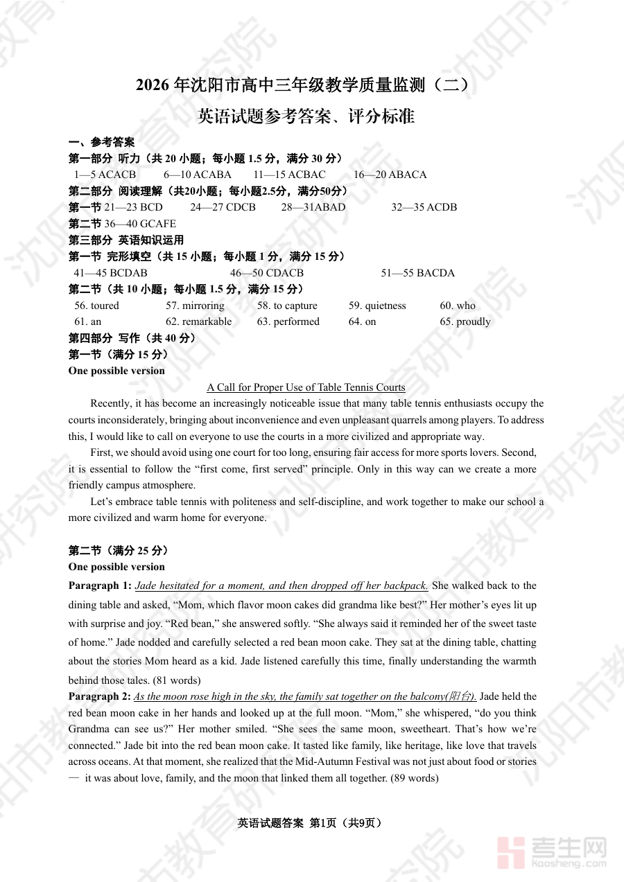 《2026年沈阳二模英语答案》是针对2026年沈阳市高三年级第二次模拟考试英语科目的配套参考答案资料。沈阳二模作为当地高三学生高考前重要的阶段性检测考试,其命题方向与难度设置通常贴近高考要求,该答案资料为考生和教学工作者提供了准确的答题参考标准,有助于全面理解考试的评价体系与得分要点,是衔接日常复习与高考冲刺的关键辅助资料。