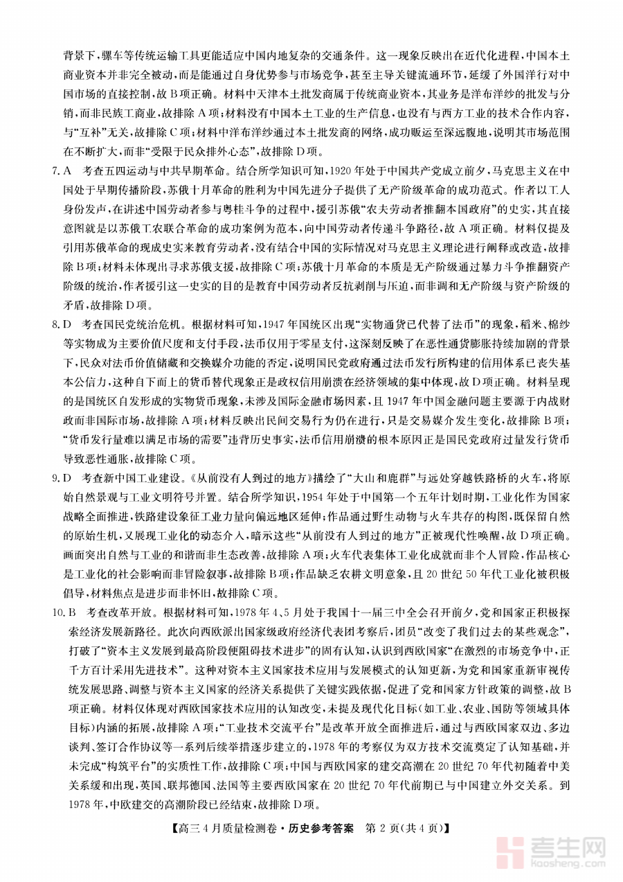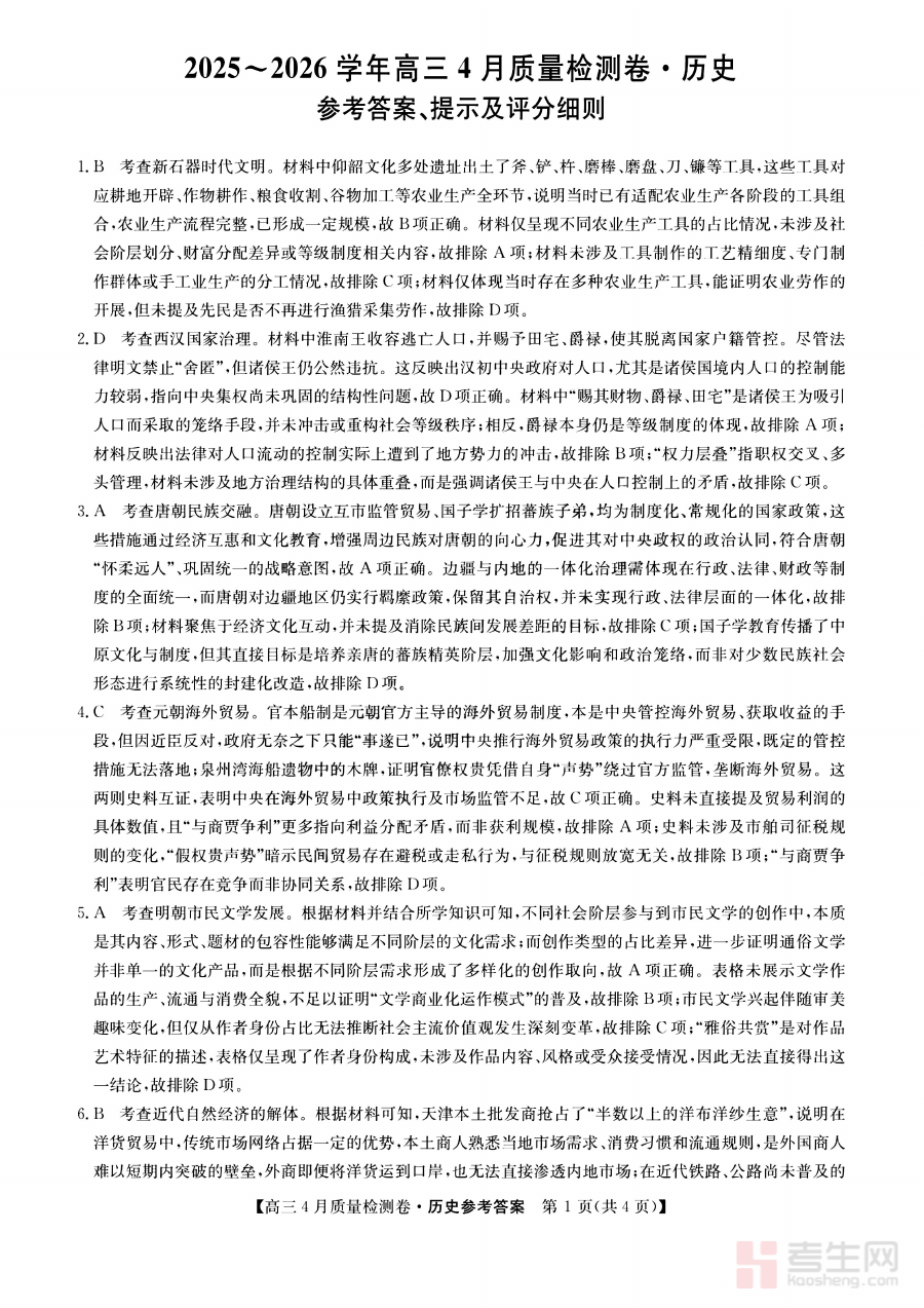 《山西省卓越联盟2025~2026学年高三4月质量检测卷 历史答案》是针对山西省卓越联盟在2025至2026学年高三年级4月组织的质量检测考试所配套的历史学科答案资料。该资料与同期的质量检测试卷形成完整配套体系,旨在为参与此次考试的师生提供权威且规范的参考答案依据,帮助师生准确把握本次考试的评价标准与命题方向,为后续的教与学活动提供基础参照。