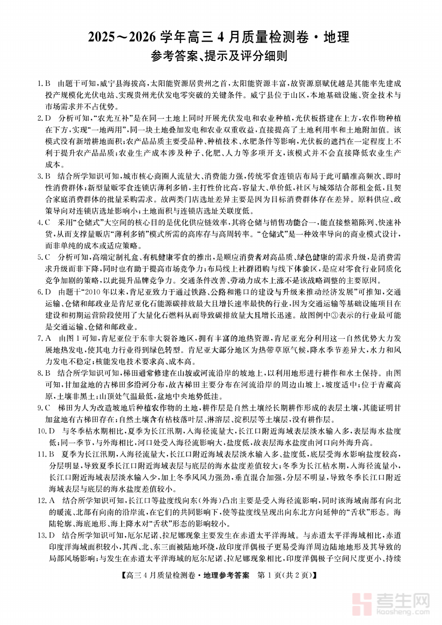 《山西省卓越联盟2025~2026学年高三4月质量检测卷 地理答案》是针对山西省卓越联盟在2025至2026学年高三年级4月开展的质量检测考试所配套的地理学科参考答案资料。作为区域性教育联盟组织的阶段性检测相关材料,它与该次考试的地理试卷内容直接对应,为使用者提供了权威且精准的答案参考,是高三地理学科备考环节中不可或缺的辅助资源之一。