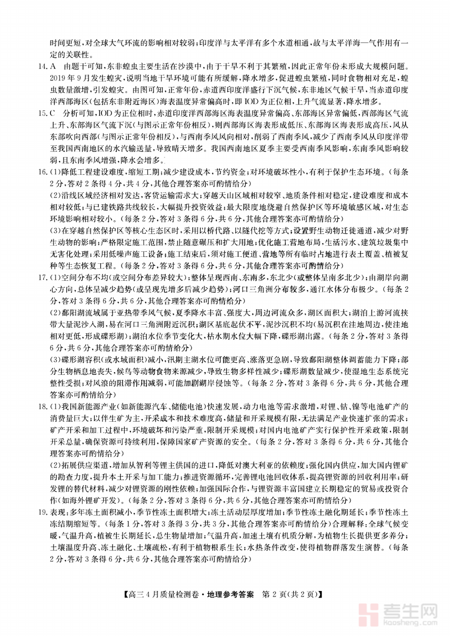 该资料的主要用途在于支持使用者对本次质量检测考试结果进行有效验证与深度分析。通过对照答案,使用者能够清晰把握自身在地理学科知识体系构建、答题规范执行以及思维方法应用等方面的实际情况,为科学开展学情诊断提供可靠依据;同时,也可帮助教师或学生针对性地调整备考规划,确保复习内容与考试要求高度契合,提升阶段复习的针对性和有效性。